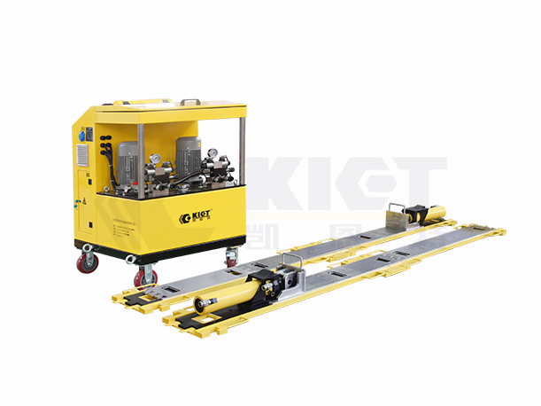 轻型滑移液压系统主要由滑道、滑靴、减磨滑移块、推拉液压千斤顶、控制泵站等组成,移动物体放置到滑靴上,滑靴与滑道上的减磨滑移块形成滑移副,通过控制液压千斤顶的伸缩来驱动物体的前进与后退;通过机械棘轮卡扣形式实现正反受力点,从而实现物体的推拉动作,特别适用于空间狭小的场合下使用,无需叉车等起重工具即可轻松使用。