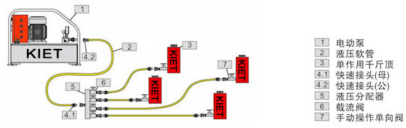 为使4台单作用液压千斤顶同时工作,首先确保千斤顶为同型号,接下来我们选择满足4台缸体容积的液压电动泵。对应的配置清单:电动泵1台,单作用液压千斤顶4台,高压接头10副(公接头、母接头),液压油管5根,液压分配阀1只、截流阀4只(可选)、单向阀4只(可选)。