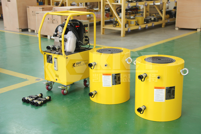 刚才我们分析了单台的配置情况,再来分析下多台千斤顶同时操作的情况。多台千斤顶同时操作意味着原先提供给一台千斤顶的油箱现在需要提供给多台,再加上多台同时顶升时效率上会受到影响,所以这时相应的我们也要选择更大功率、更大油箱容积的电动泵。除非很小吨位、行程很低的千斤顶我们可以选择0.75KW或1.1KW电动泵,大部分时候我们都应该选用能够满足功率和油量的2.2KW或5.5KW电动泵。另外我们还可以选择专为多台大吨位千斤顶同时操作的同步定量泵,其拥有更大的油箱容积以及双电机、三电机或者多电机。