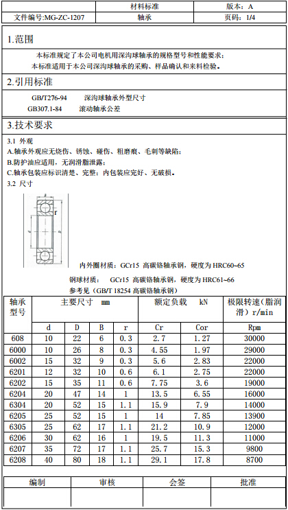 本标准规定了本公司电机用深沟球轴承的规格型号和性能要求;本标准适用于本公司深沟球轴承的采购、样品确认和来料检验。